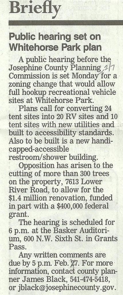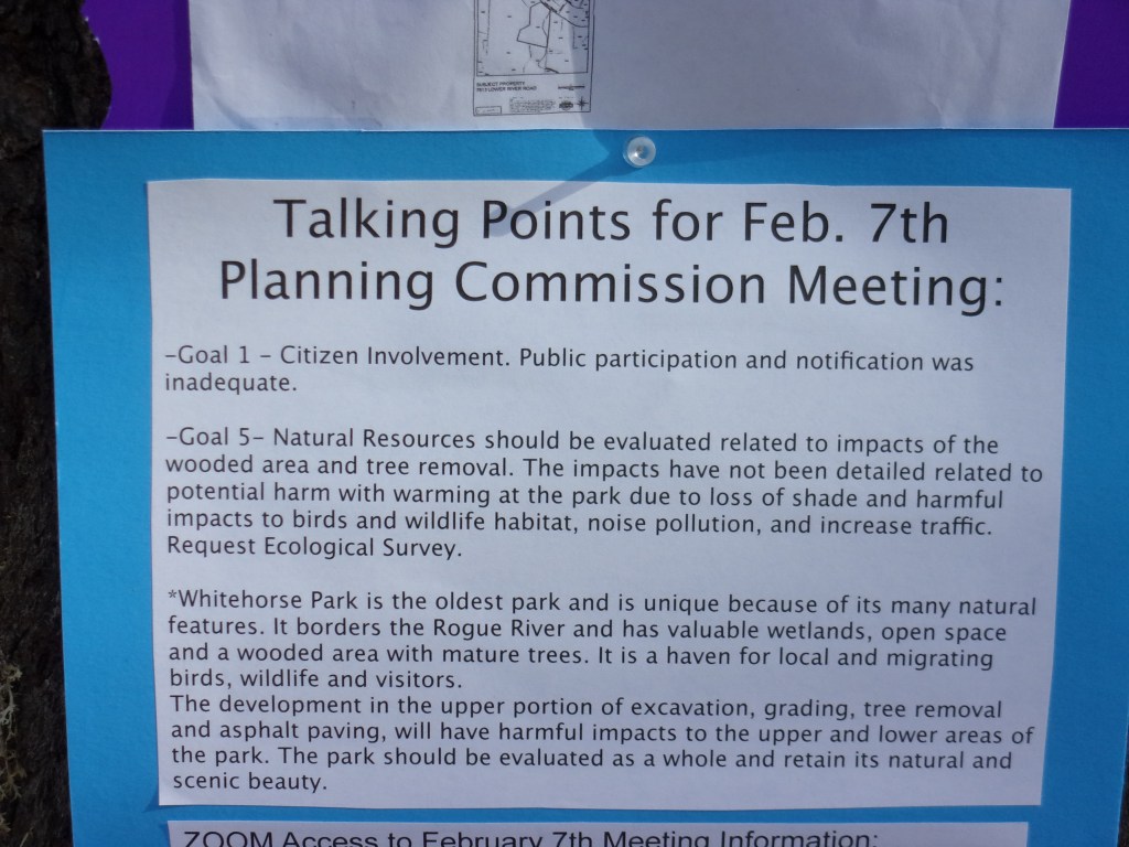 The rally on Saturday, February 5 at Whitehorse Park in Grants Pass had a turnout of at least 50 people concerned about the Josephine County proposal to cut down over 300 mature, healthy trees to pave an area for RV hook-ups.