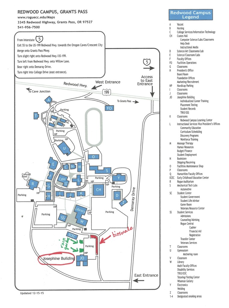 Friday, June 25, we will be mulching and pulling weeds at the RCC raingarden/bioswale from 10:00 am – noon. Chas will bring a truckload of mulch, and we will be joined by EARTH Club students. Plan to get your feet wet and your hands dirty — it should be great fun! Below you will find a map of the RCC Grants Pass campus showing the location of the bioswale near the Josephine Building.