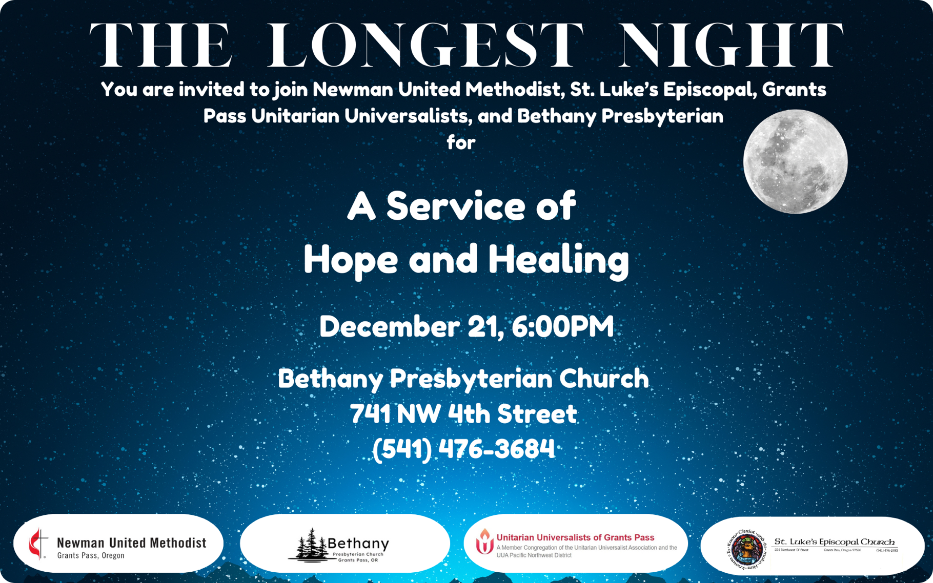 Sunday, December 21 at 6:00 pm – The Longest Night Service honoring Homeless Persons Memorial Day – Bethany Presbyterian Church (741 NW 4th St, Grants Pass, OR)